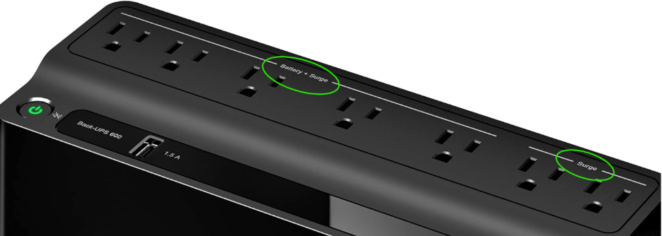 - Battery + Surge: Outlets controlled by the power button that will receive battery power during a power failure. You should plug your computer and monitor into these outlets and any externally powered critical data storage device.